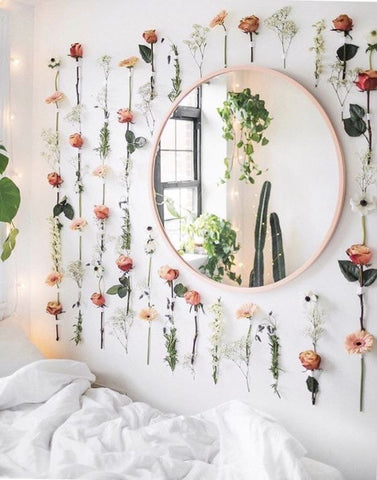 With just fishing line and fake flowers, you can make this gorgeous flower wall by threading the fishing line through the flowers and hanging them around a window or door, above your bed, or even from the ceiling!