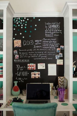 Chalkboard paint is an awesome option for a small wall, door, furniture, or entire wall! Get some chalk and add some custom doodles and quotes to your room.